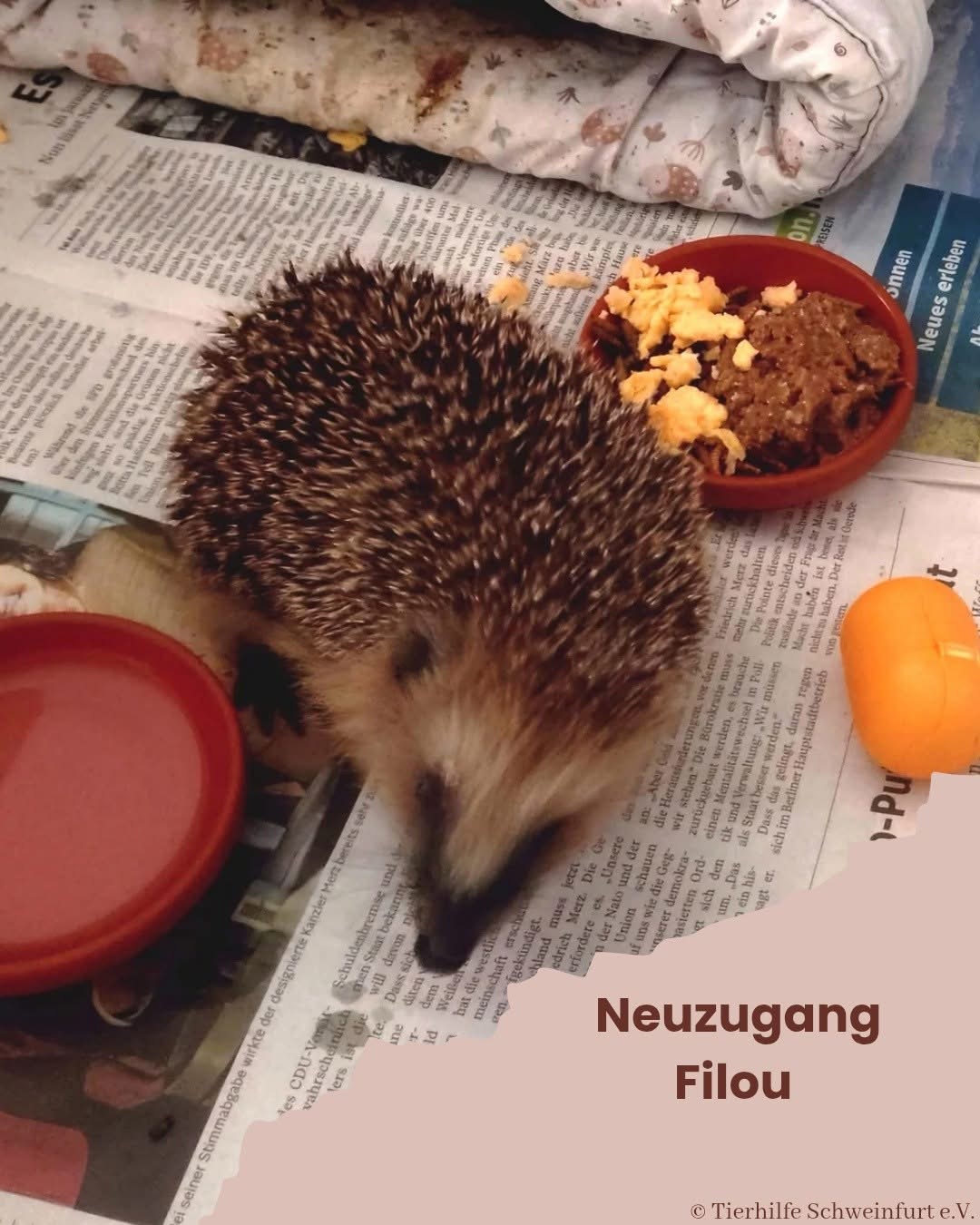 Neuzugang Igel FilouTierhilfe8. April 2026AllgemeinKatzenbabys , Entenküken , Eichhörnchenwinzlinge , Kaninchen … Unsere Pflegestellen haben schon wied…Weiterlesen