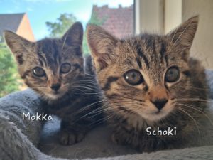 Ihr lieben Menschen da draußen. Wir sind Schoki und Mokka. Nein, wir sind keine neue Kaffeesorte, sondern zwei ganz liebe und verspielte kleine Fellnasen, die sich auch gerne streicheln lassen. Schoki ist der getigerte Katzenbub und Mokka das Mädchen mit dem getigerten Gesicht und den dunklen Flecken am Rücken.  Vermutlich haben wir 05 / 2025 unsere Tatze auf diese Welt gestellt. Leider können die netten Menschen von der Tierhilfe nicht…