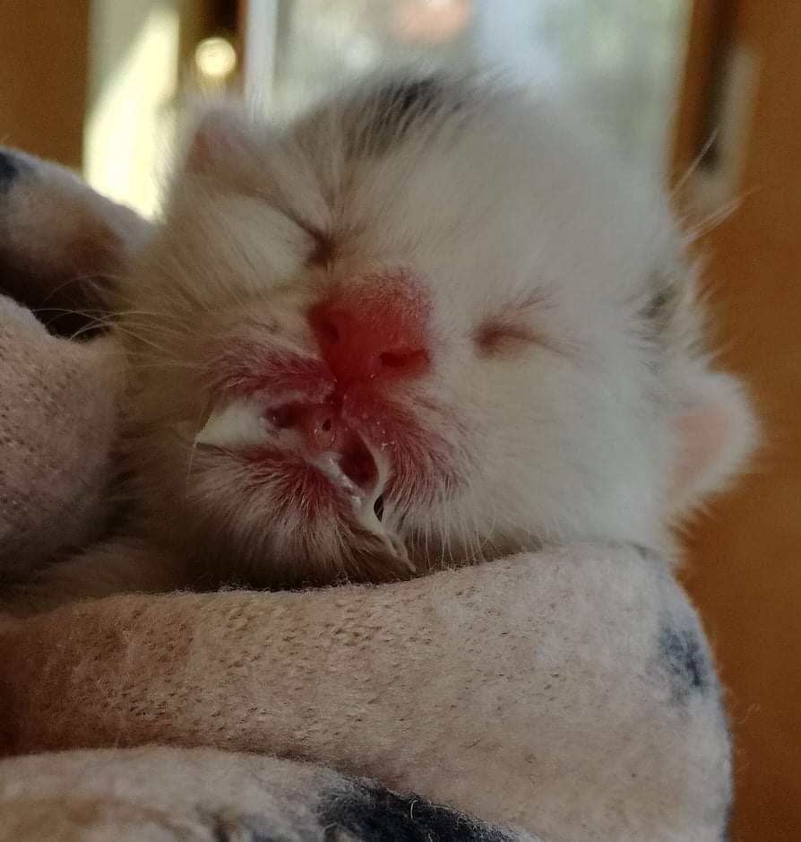 Der kleine Kater, wurde schnell zu einer unserer Pflegestellen gebracht. Dort wird er liebevoll gepflegt und mit der Flasche großgezogen.