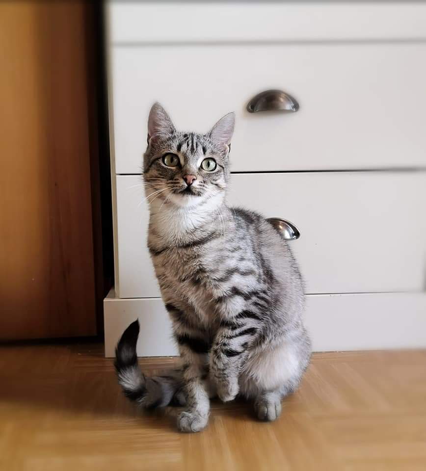 Cara ist eine grau getigert Schönheit mit seidenweichem Fell (die Mama ist eine Langhaar Katze). Jedoch möchte sie ihr schönes Fell mit niemandem teilen. Anfassen mag Cara leider noch nicht.