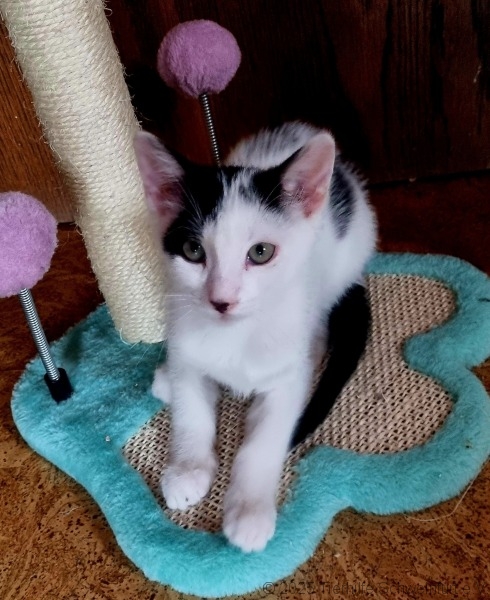 Du darfst mich aber auch Coco Loco nennen, denn ich bin eine ganz lustige und lebhafte Maus. Das liegt vielleicht auch an meinen Piratenlook, den ich dank meiner Augenklappen-Schwarzfärbung um mein rechtes Auge habe. Nein, nein, nur Spaß, ich bin wirklich ein liebes Mädchen und typisch für mein Alter sehr neugierig. Ich bin fast schon mein ganzes Leben hier auf der Pflegestelle. Ich wurde gemeinsam mit meinen Geschwistern Cosma, Cassandra und Clavius am Ostersonntag geboren. Unsere Mama war eine Streunerin, die ganz plötzlich nicht mehr zu uns zurückkehrte. Und nur vier Tage später waren wir hier. Das war auch Rettung in letzter Sekunde, weil wir wirklich schon beinahe verhungert waren. Das war echt kritisch, aber das viele Daumen drücken von ganz vielen lieben Menschen hat wirklich geholfen und nun sind wir alle alt genug, um auszuziehen.