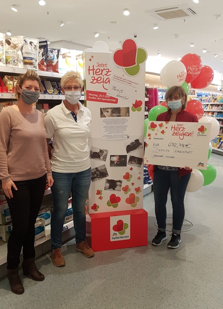 Es geht ein großes Dankeschön an den DM-Drogeriemarkt in Schweinfurt am Bergl! Am Montag, den 28.09.20 hat dort der Spendentag für die Aktion „Jetzt Herz zeigen“ statt gefunden. Dieser ging bereits in die vierte Runde. Fünf Prozent desTagesumsatzes wurden an ausgewählte Partnerorganisationen gespendet. DieMitarbeiter aus den DM-Märkten hatten individuell ihr Herzensprojektausgewählt, welches sie durch die Aktion unterstützen wollten.Wir freuen uns riesig dass der DM-Drogeriemarkt in Schweinfurt am Bergl,Oskar-Miller-Straße 6, hierfür die Tierhilfe Schweinfurt, Katzenschutz in Unterfranken e.V., ausgewählt hatte