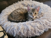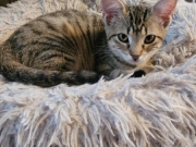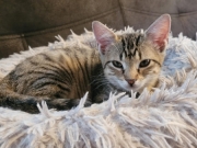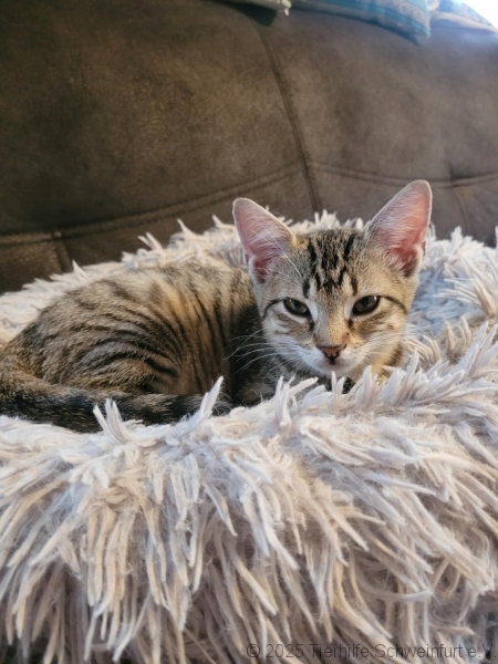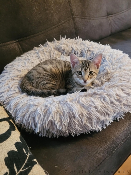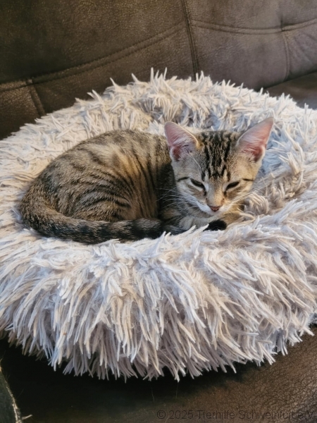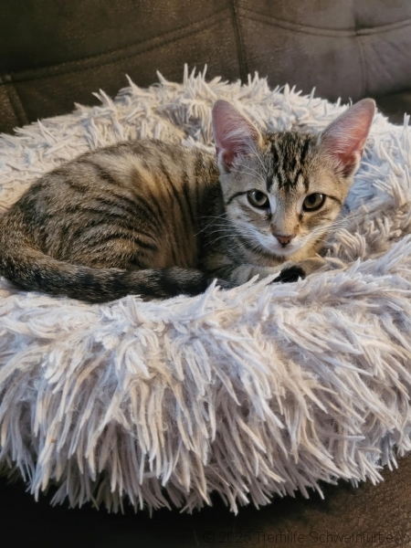 Hey hey, ich bin Devi, „die Himmlische“. Hübsch, oder? Himmlisch bedeutet unter anderem auch einfach super und das bin ich auf jeden Fall. Ich habe ja noch drei Geschwister und da war ich anfangs die Größte. Mittlerweile hat mich mein Bruder Diego an Größe überholt, aber ich kann es immer noch gut mit meinen beiden Brüdern aufnehmen und lasse mir nichts gefallen. Ich weiß genau, was ich will und was ich kann. Zum Beispiel ist hier niemand so erfolgreich im Fliegenjagen und -fangen wie ich. Ich bin ziemlich flink und gescheit und die Pflegemama sagt, ich war meinen Geschwistern von Anfang an immer ein bißchen voraus. So habe ich als erste kein Milchfläschchen mehr gebraucht und konnte auch als erste ganz alleine aufs Katzenklo gehen. Jetzt fragst Du Dich sicher, warum ich ein Milchfläschchen gebraucht habe. Das ist, weil meine Geschwister und ich Waisen sind. Unsere leibliche Mama wurde leider überfahren und hat uns zurückgelassen.