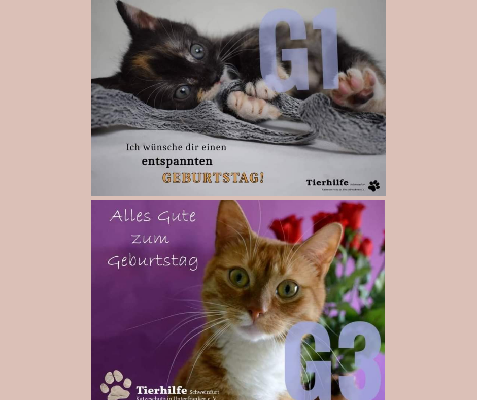Kennt ihr noch unsere Klappkarten?Auf den Karten seht ihr ehemalige Pflegekatzen, die auf unseren Pflegestellen Modell gestanden haben für ihre Vermittlung. Bei dem ein oder anderen Schnappschuss, unserer ehrenamtlichen Fotografen, waren wir etwas Kreativ und haben diese Bilder noch etwas gestaltet.
