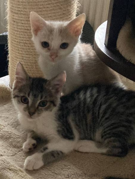 Da wir beide noch kleine Mädchen sind, sind wir sehr neugierig, verspielt und verschmust. Das werden wir aber wohl auch den Rest unseres Lebens bleiben, denn so sind Flaschenkätzchen einfach. Darum haben wir auch keine Angst vor irgendwem und mögen eigentlich alle und jeden. Auch größere Kinder kennen wir schon und finden die gut, weil sie immer mit uns spielen und kuscheln. Selbst Hunde sind kein Problem für uns, denn die kennen wir auch von hier.