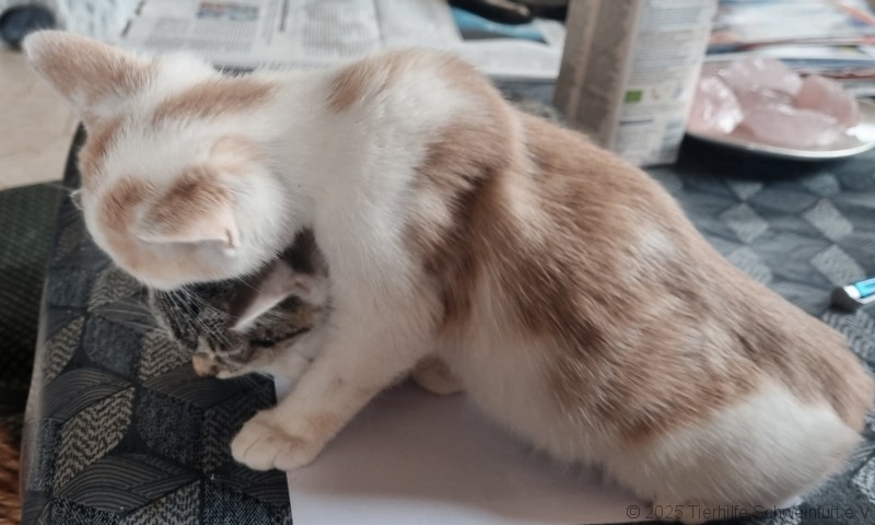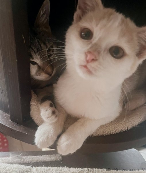 Ich, Nila, das zuckersüße Tigerchen, war ca. drei Wochen alt, als man mich mutterseelen alleine fand. Meine Mama konnte nicht mehr gefunden werden. Und ich, Evi, die zarte weiße Elfi mit den apricot-farbenen Abzeichen, war noch viel kleiner, als meine Mama mich nach der Geburt nicht mehr annehmen wollte. Wir haben beide