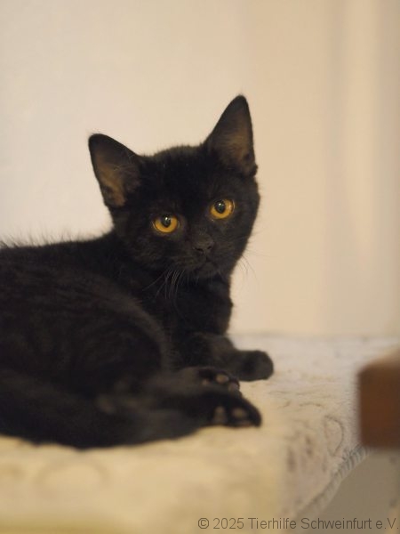 Also ehrlich, ich habe gehört, manche Menschen finden, schwarze Katzen bringen Pech. Wo die den Quatsch her haben … Ich bringe ganz viel Glück und Freude und bin noch dazu ein sehr hübsches, kleines Mädchen. Doch keine Sorge, ich kann mich auch sehr gut behaupten und mit den Jungs hier halte ich gut mit. Mit meinem Bruder Humphrey und meinem Kumpel Karlo mache ich jeden Blödsinn mit und bin beim Raufen immer dabei. Aber ich habe auch eine ganz sanfte Seite und liebe jede noch so kleine Schmuseeinheit.