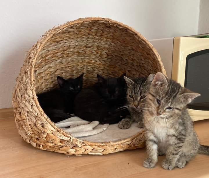 Die Geschwister Gero, Grisu und Gwendolyn haben sich nach kurzer Eingewöhnung mit ihrer Mama Gesa gut auf ihrer Pflegestelle eingelebt.Die drei Kitten lieben es zu spielen und die Wohnung neu zu dekorieren. Die Pflegestelle ist zwar der Ansicht, dass zerrupfte Zeitungen, sorgfältig verteiltes Streu und andere Krümel nicht als ‚Dekor‘ zählen, aber da sind sie entschieden anderer Meinung. Mama Gesa erträgt die Eskapaden – Entschuldigung: die kreativen Geniestreiche – mit Engelsgeduld und versorgt sie liebevoll. Sie zeigt ihnen alles, was kleine Kitten können müssen. Die Jungs (beide schwarzes Fell) testen ihre Kräfte in ausgedehnten Spielkämpfen, nur unterbrochen von kurzen Boxenstopps am Futterplatz. Gwendolyn, die sehbehindert ist, hat gute Strategien entwickelt, um sich zu orientieren, sicher auf dem Kratzbaum zu klettern und generell mit ihren energiegeladenen Brüdern mithalten zu können. Sie ist eine kleine Draufgängerin und eine noch viel größere Kuschlerin – das darf nicht zu kurz kommen und sie fordert es bereits aktiv von ihrer Pflegestelle ein. Auch ihre Brüder werden beim Streicheln schnell wieder ruhig und anschmiegsam.Jetzt heißt es noch ein wenig wachsen und sich weiter an die Menschen gewöhnen, bevor die vier sich auf die Suche nach einem eigenen Zuhause machen können.
