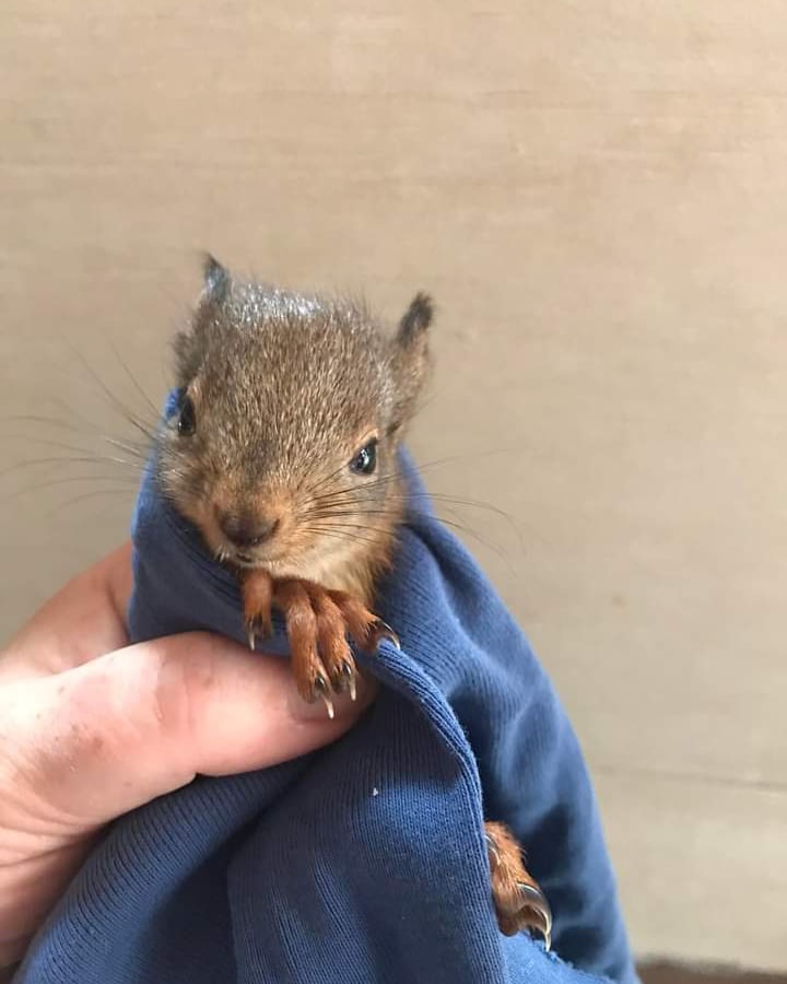 Ein sehr lieber aufmerksamer Mann schnappte sich das Eichhörnchenkind und suchte nach Hilfe. Dabei musste er sich auch hämische Kommentare anhören, er soll das Tier doch ordentlich an den Baum hauen, das wird doch nichts mehr, usw.