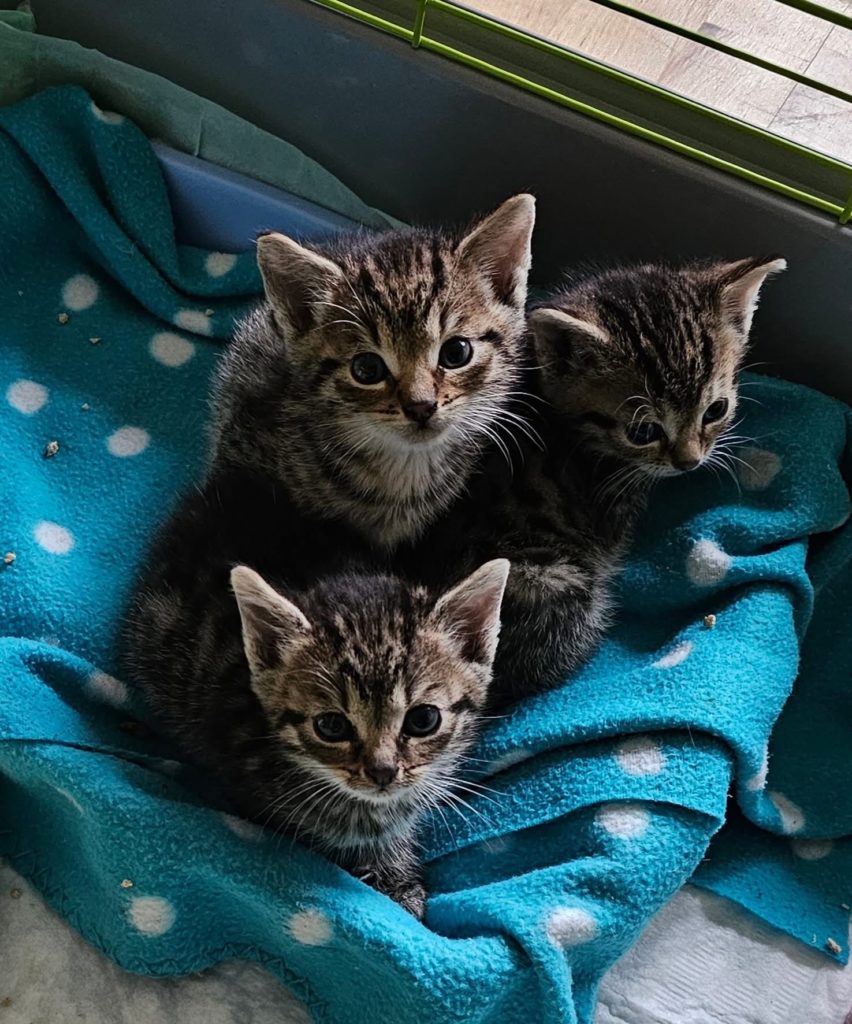 Ihre Mama konnte sich leider nicht mehr um sie kümmern , und so kamen die drei kleinen Schätze zu uns, wo sie nun in liebevoller Obhut sind. Jetzt liegen sie warm eingekuschelt , satt gefressen und endlich sicher – bereit, die Welt kennenzulernen.