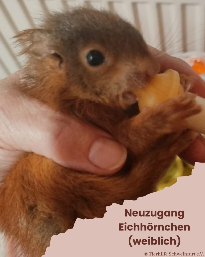 Ein kleines Eichhörnchenkind – maximal sechs Wochen alt – suchte seit mehreren Tagen auf einer Terrasse verzweifelt nach ihrer Mutter . Die Besitzer der Terrasse erkannten die Notlage und baten uns um Hilfe. Alles richtig gemacht , denn die kleine Zuckerschnute ist definitiv viel zu klein , um alleine zu sein.