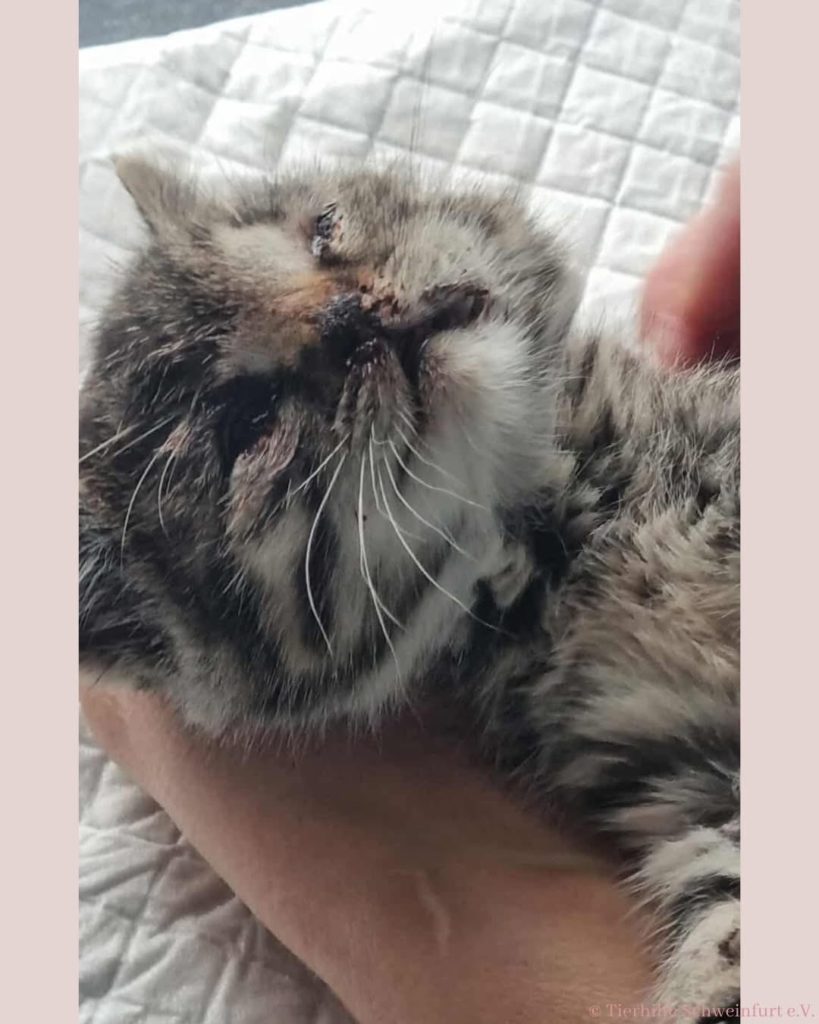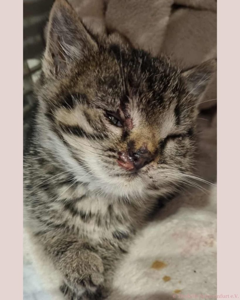 Urmel kam sofort in tierärztliche Behandlung. Sie hat starke Verletzungen im Gesichtsbereich, ein Schädel Hirn Trauma, ihre Zähnchen sind auf einer Seite fast heraus und verschoben – wegen der Zähne muss sie noch einmal operiert werden.
