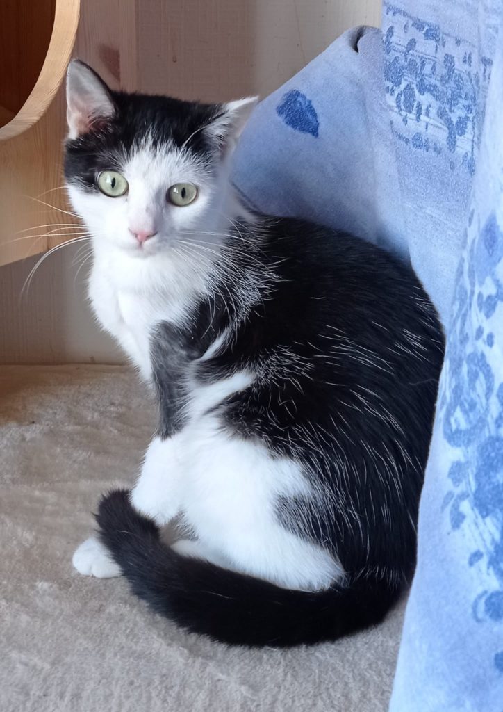 Felizitas hat wohl Schlimmes in der Vergangenheit erlebt und hatte anfangs panische Angst vor Menschen. Inzwischen kommt sie sogar schon an den Futternapf, wenn man noch dabei steht und es gelingt immer öfter, sie zu streicheln ohne dass sie es bewusst merkt.