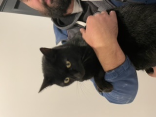 Am Montag den 01.11 ist uns eine schwarze Katze vor der Tür aufgefallen. Nach paar Stunden sah’s sie immer noch vor der Tür möchte nicht weg gehen kommt oft ins Haus. Katze ist zugänglich und lieb. Hat jetzt eine Nacht vor der Tür geschlafen läuft nicht weg. Im Ohr haben wir ein Tattoo gesehen.