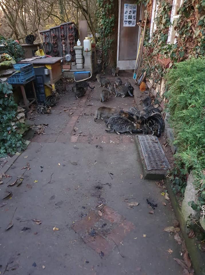 Wie der Besitzer uns erzählte, hat es vor ca. 3 Jahren angefangen, damals hatte er mal hier und mal da eine Katze erblicken können, aber auf einem großen Grundstück, fällt es einem nicht sofort auf und nun sind es über 30 Katzen.