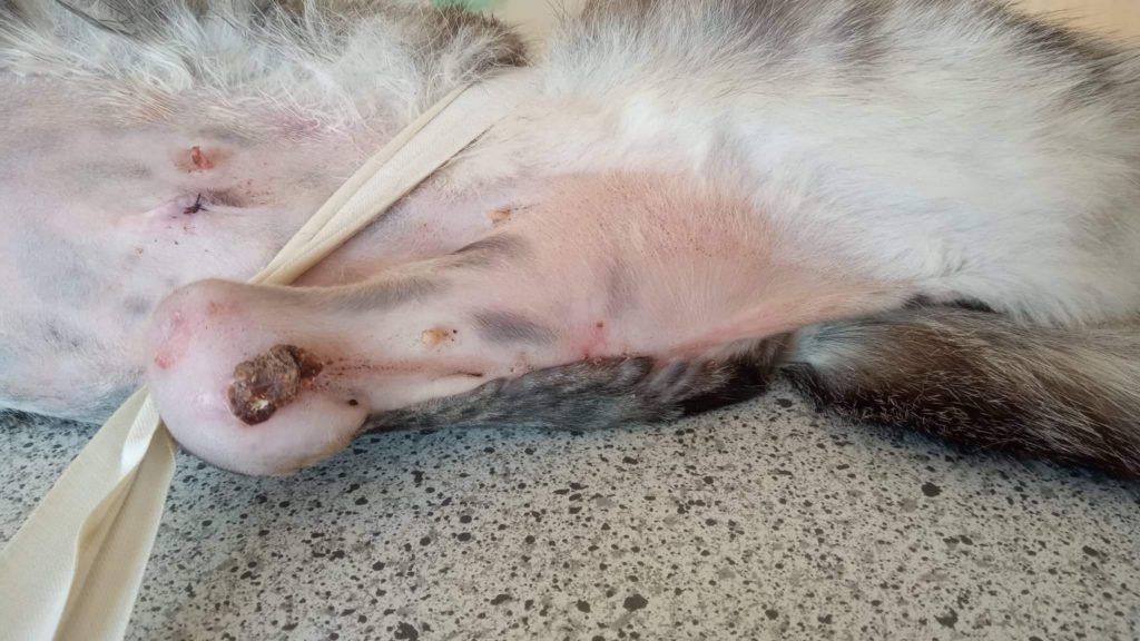 Nach einem nochmaligen kleinen Rückschlag konnte die Wunde mit viel Ruhe und Antibiose gut heilen. Es ist nur noch eine kleine Stelle übrig, die sich voraussichtlich die nächsten 1-2 Wochen verschließen wird. Trixie konnte mittlerweile auch kastriert, tätowiert und gechipt werden.