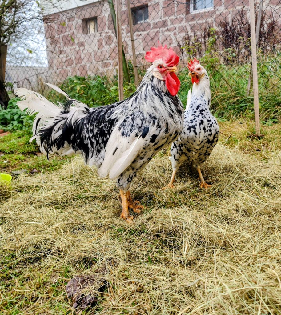Johahn, ein stattlicher Hahn der Rasse Leghorn Exchequer, mit Haltung, Herz und einem liebevollen Wesen, und seine Herzdame Apfelhühnchen, eine echte Naturschönheit mit Charakter.