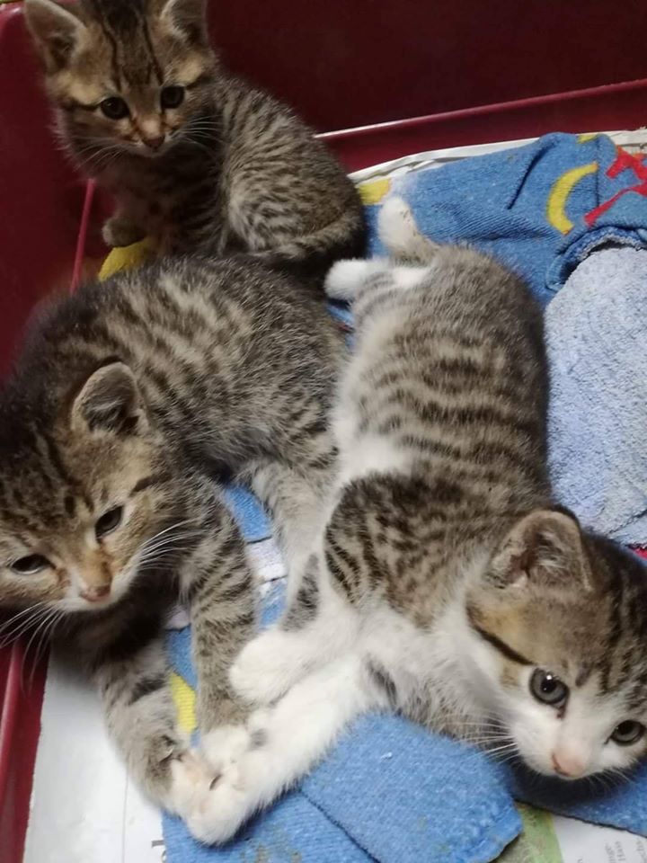 Nachdem bereits eines der Kleinen in der Güllegrube ertrank brachten glücklicherweise aufmerksame Menschen die drei Kleinen gestern zu uns. Leider haben sie starken Durchfall und Katzenschnupfen.