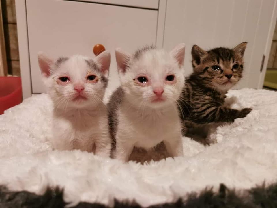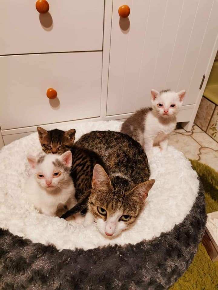 Penny Lane’ und ihre Babys ,Sgt. Pepper, Johnny B und Dizzy Miss Lizzy‘ sind auf einer unserer Pflegestellen angekommen. Penny Lane ist sehr erschöpft, nun kann sie aber in Ruhe wieder zu Kräften kommen und ihre Babys großziehen. Sie ist jetzt schon sehr dankbar für ein weiches Bettchen und ihren vollen Futternapf